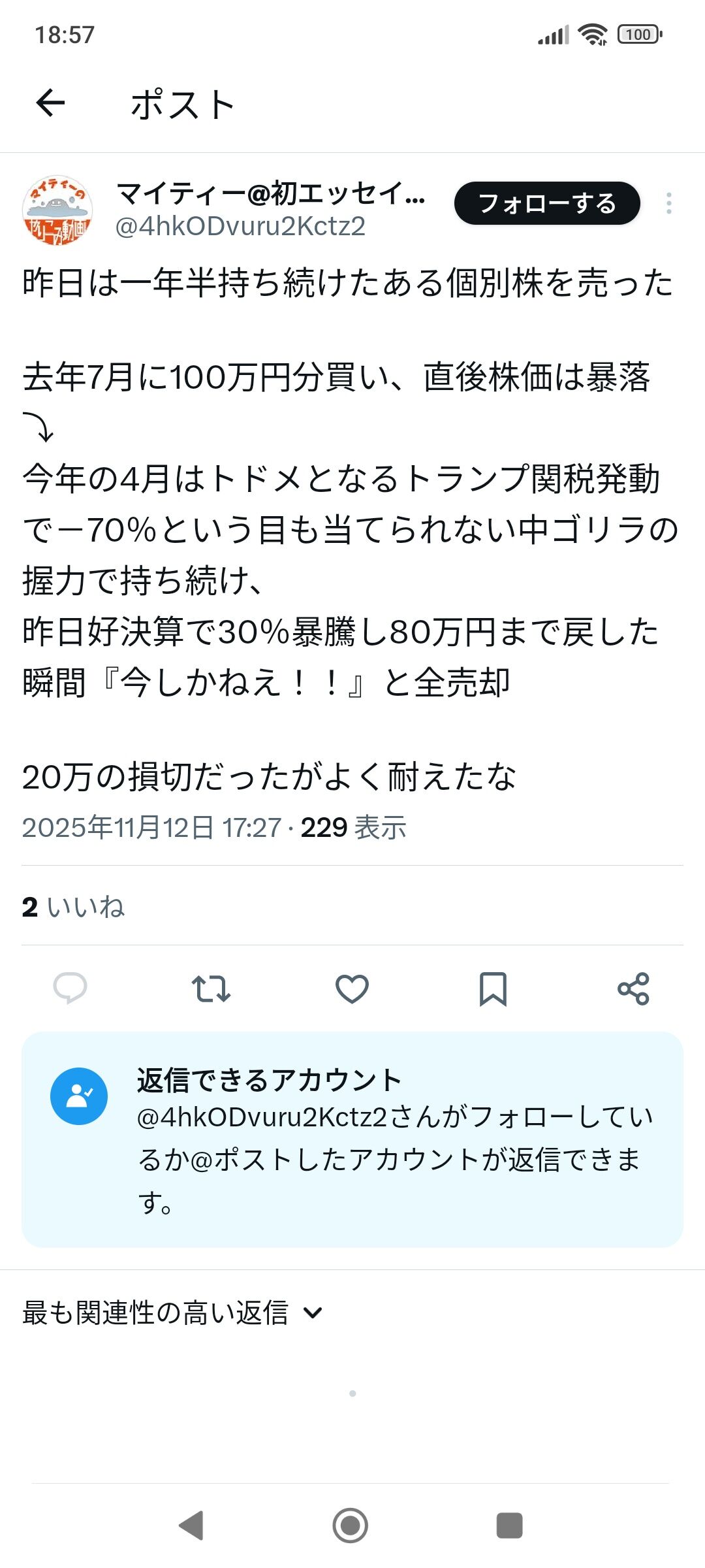 学生じゃあるまいし株式投資しました100万円とか恥ずかしくならんのか?